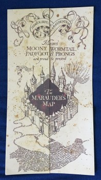 The folded-up Marauder’s Map, tall and cream coloured, with decorative artwork in black ink. Near the top is the text Messrs Moony, Wormtail, Padfoot and Prongs are proud to present. Below this is a 4 walled square castle with the text The Marauder’s Map in the centre on a black background.