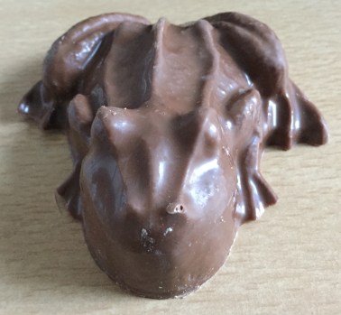 Large piece of chocolate sculpted into the shape of a frog, with webbed feet, spine detailing, and bumps for the eyes and nostrils.