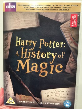 DVD cover for Harry Potter – A History Of Magic. The title is in gold lettering on a black background in the centre, surrounded by old papers and books and a magic wand.