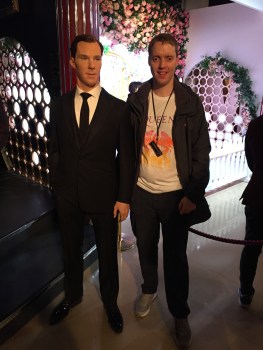 Glen posing with a waxwork of Benedict Cumberbatch at Madame Tussauds. Benedict is dressed in a smart suit, with a black jacket and trousers, long black tie and a white shirt.