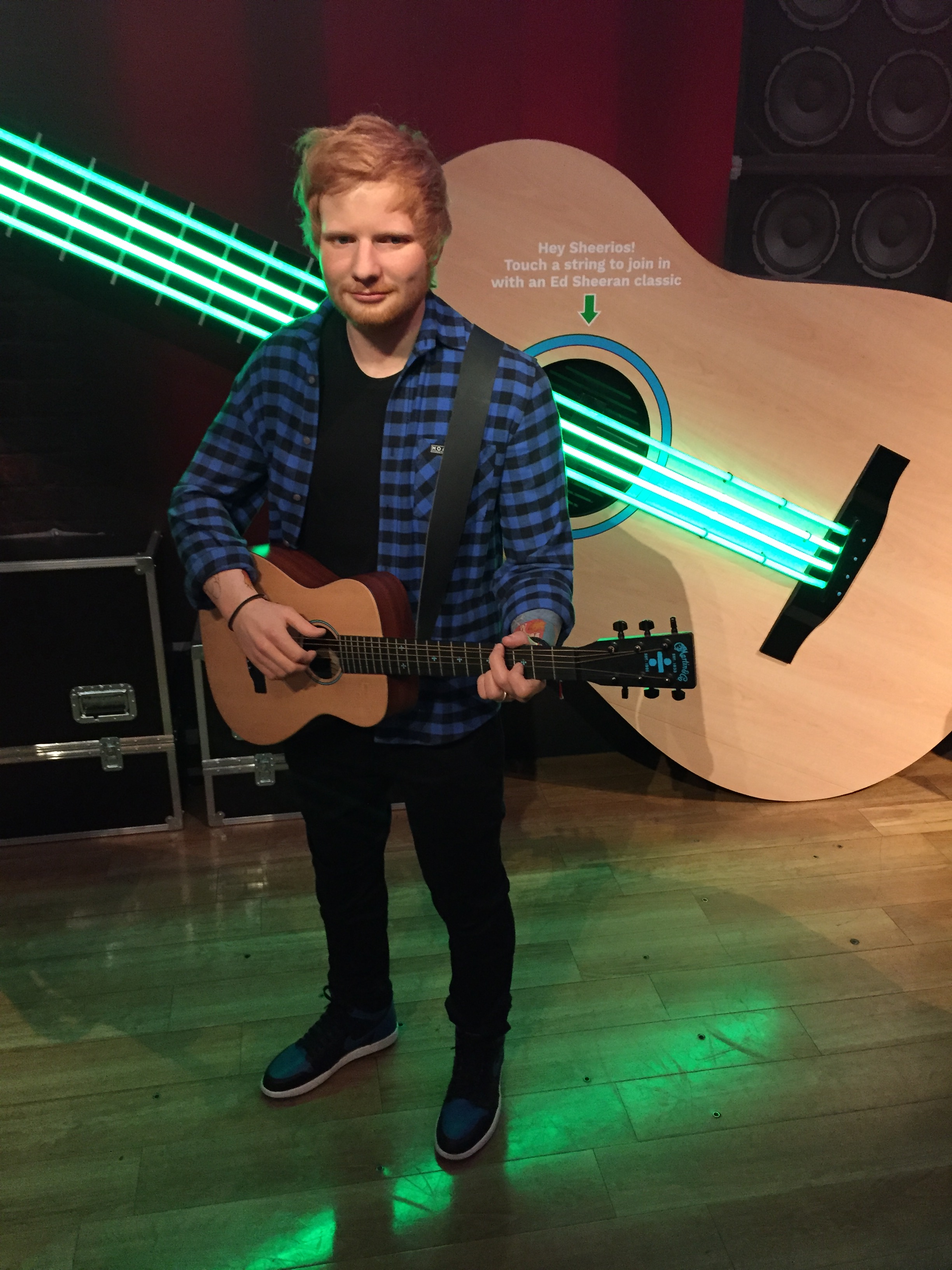 Waxwork of Ed Sheeran at Madame Tussauds. He is wearing a blue and black checked shirt over a black t-shirt, and black trousers, and is playing his guitar. A huge guitar on the wall behind him has 4 long strings that are glowing green. Text above it says Hey Sheerios, touch a string to join in with an Ed Sheeran classic.