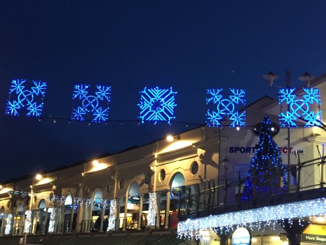 Lit-up blue snowflakes over the high street in Torquay. Behind them, a Christmas tree with blue and white lights is on a canopy above the entrance to a shopping centre. Further down the street are more arrangements of white lights in between the windows of the buildings, and other lit-up decorations suspended across the street.