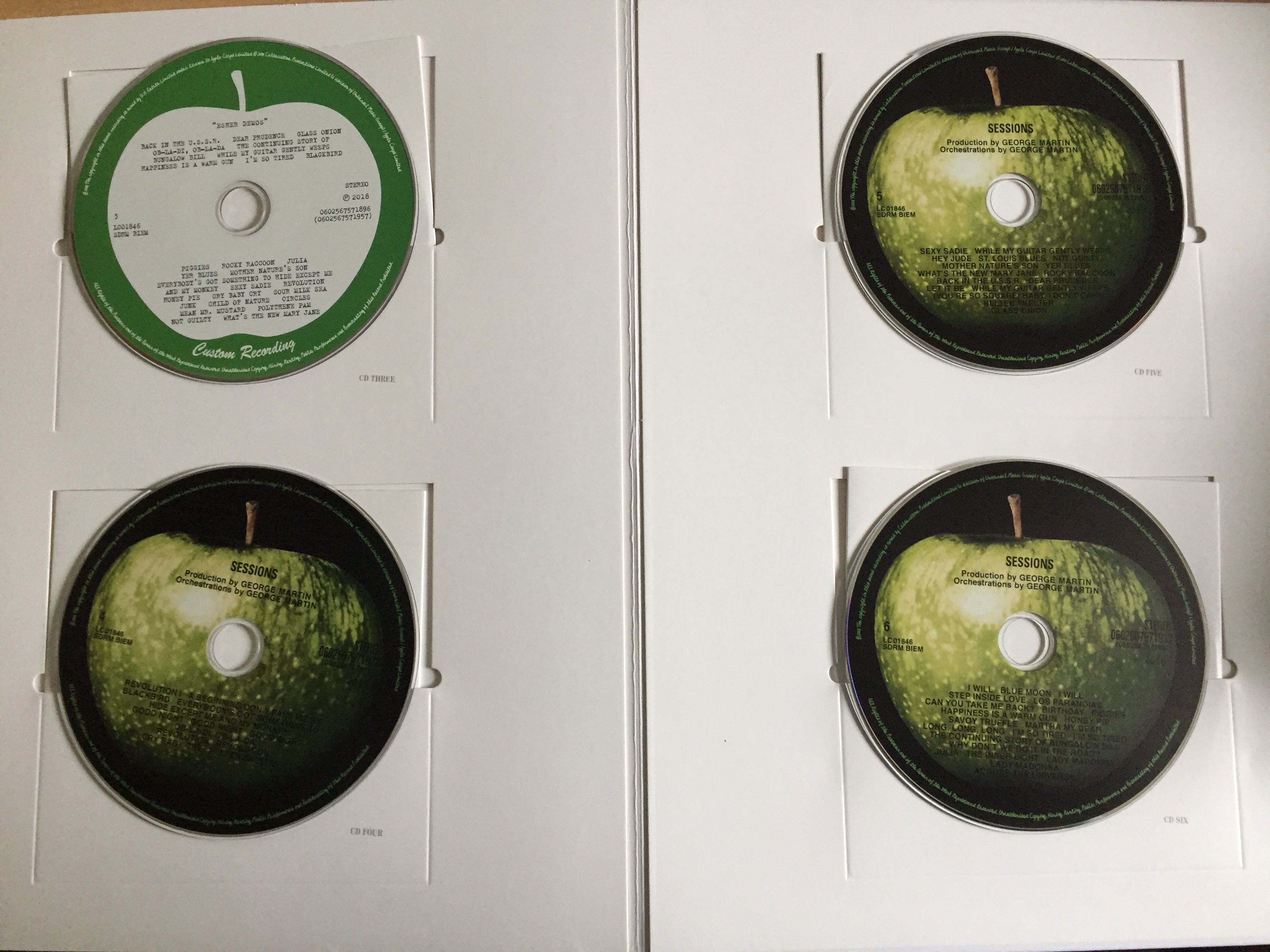 The inside back cover of the large book for The White Album boxset, showing the last 4 CDs, and the white sleeves they came out of. The discs are each filled with a large image of an apple – which is whole on the 3 sessions CDs, and a white silhouette on the Esher Demos CD. The track listing on each disc is on top in black text.