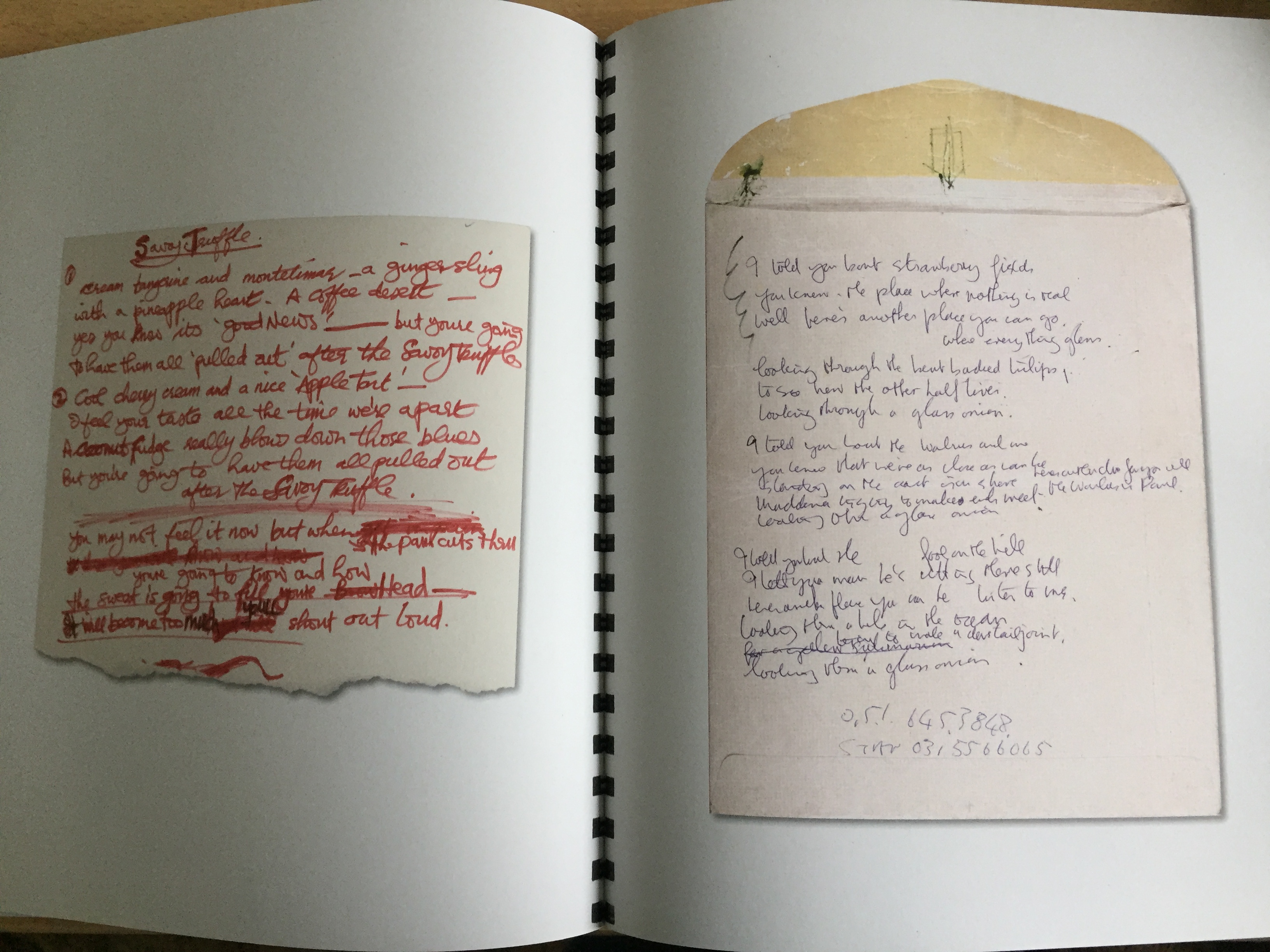 2 pages from the book for the White Album box set, each showing a colour photograph of a piece of paper with handwritten lyrics on it. The central spine between the pages is printed all the way down with small black blocks so that it looks like a binder.