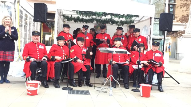 A choir of Chelsea Pensioners, a mixture of men and women who are smiling while wearing red jackets with large round buttons and many medals, along with black trousers. Their female conductor, smiling and applauding them to one side, is wearing a Christmas jumper, a tartan skirt and black tights.