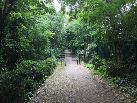 A long, narrow footpath lined with trees, the branches of which meet overhead. There are alternating light and dark patches on the path depending on where the sun is shining through the trees.