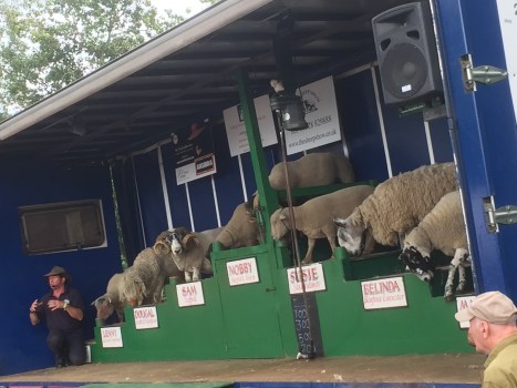 7 sheep on podiums, on a stage at the Lambeth Country Show, with the tallest podium in the centre, and the others either side stepping down away from it, giving a pyramid formation. One sheep’s name on its podium is obscured from view, but the others are called Lenny, Dougal, Sam, Nobby, Susie and Belinda.