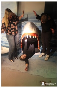 Glen and Louisa on either side of a large model of a shark’s open mouth, looking down with their arms up in mock horror as Jody pretends to be swallowed by the shark.