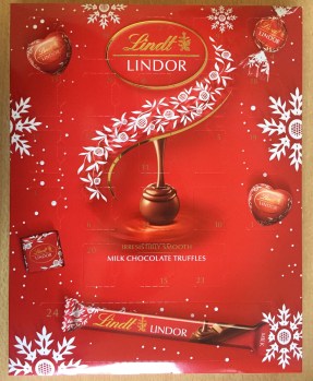 Lindt Milk Chocolate Truffles Advent Calendar. The red box has white leaves and snowflake decorations on it, and a large truffle having chocolate poured over it in the centre. The numbering on the doors is gold on the red background. The bottom door is much longer than the others, as it contains a Lindor chocolate bar rather than a small truffle.