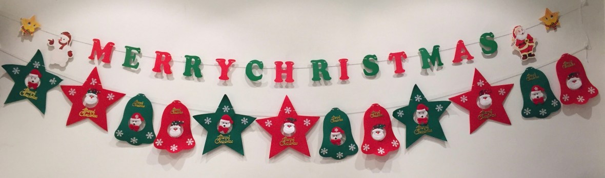 Festive banners hung on the wall on 2 lengths of string. The top string has alternating red and white letters spelling Merry Christmas. The lower string has alternating red and green stars and bells with Santa faces in their centres.