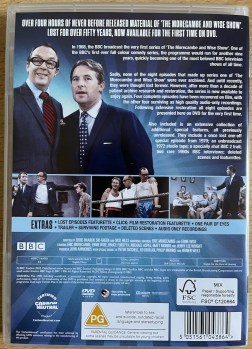 DVD back cover for Morecambe And Wise The Lost Tapes, with a photo of the duo dressed in suits and smiling, plus smaller photos of a few scenes from the episodes, a description of the DVD and a list of extra features.