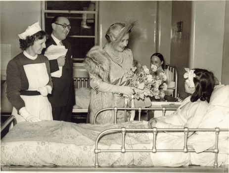 A black and white photo of 2 young girls in hospital beds being greeted by the Queen Mother, who is smiling and holding a large bunch of flowers. A female nurse and a gentleman in a suit, both also smiling, stand behind Her Majesty.