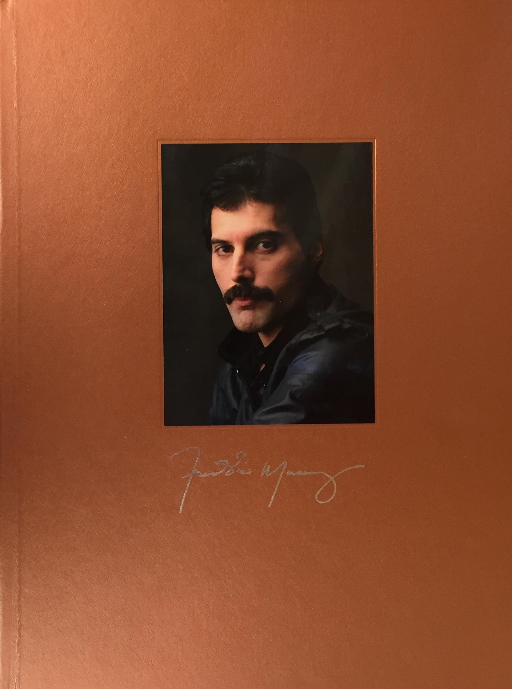 Front of the Freddie Mercury Solo Collection Boxset. A photo of Freddie is in the centre, his head and shoulders visible, wearing a dark jacket. His signature is printed under the photo in silver.