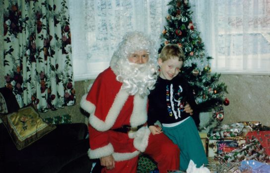 Me as a young child, smiling and leaning against Santa Claus, who has his arm around me. It’s my grandad dressed up. We’re in front of the Christmas tree and presents, next to the living room window.