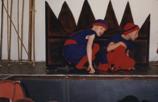 Me and another boy, dressed in blue robes and red leggings, with blue and red hats, crouching on stage next to a spiky wall, hiding from the people we’re spying on.