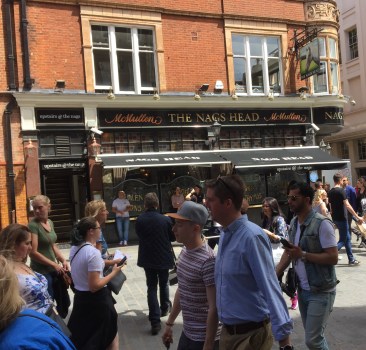 A pub, under the brand McMullen, called The Nag’s Head, with a picture of a white horse on the pub sign hanging by one of the upper windows.