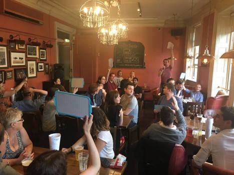 A big group of people in a pub room taking part in the Thinking Bob Ultimate Pub Quiz. Glen is on a table towards the right, resting his head on his chin while a team mate smiles while holding up a piece of paper.