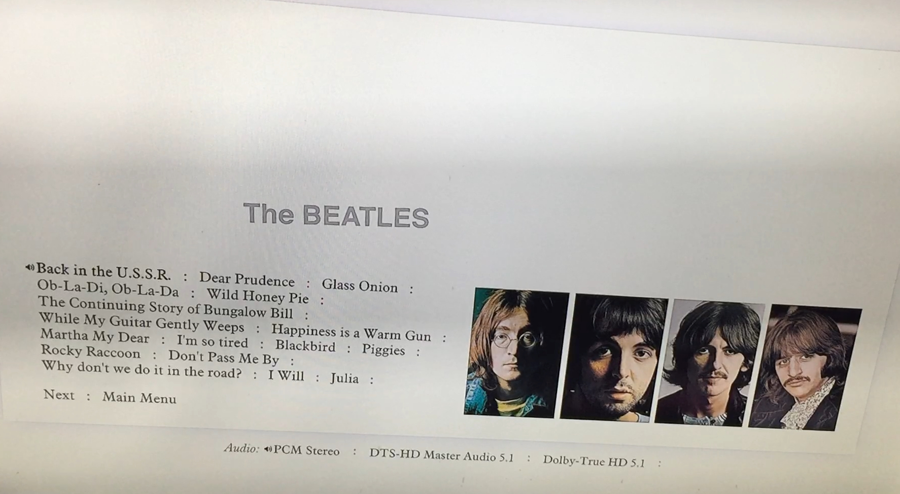 Album tracks menu on the Blu-ray disc for the White Album box set. On a white background, the tracks for the first half of the album are in black on the left, while on the right are 4 portrait photos of the band members. Audio options for stereo and 5.1 sound are at the bottom of the screen, and just above the track listing is larger grey text saying The Beatles.